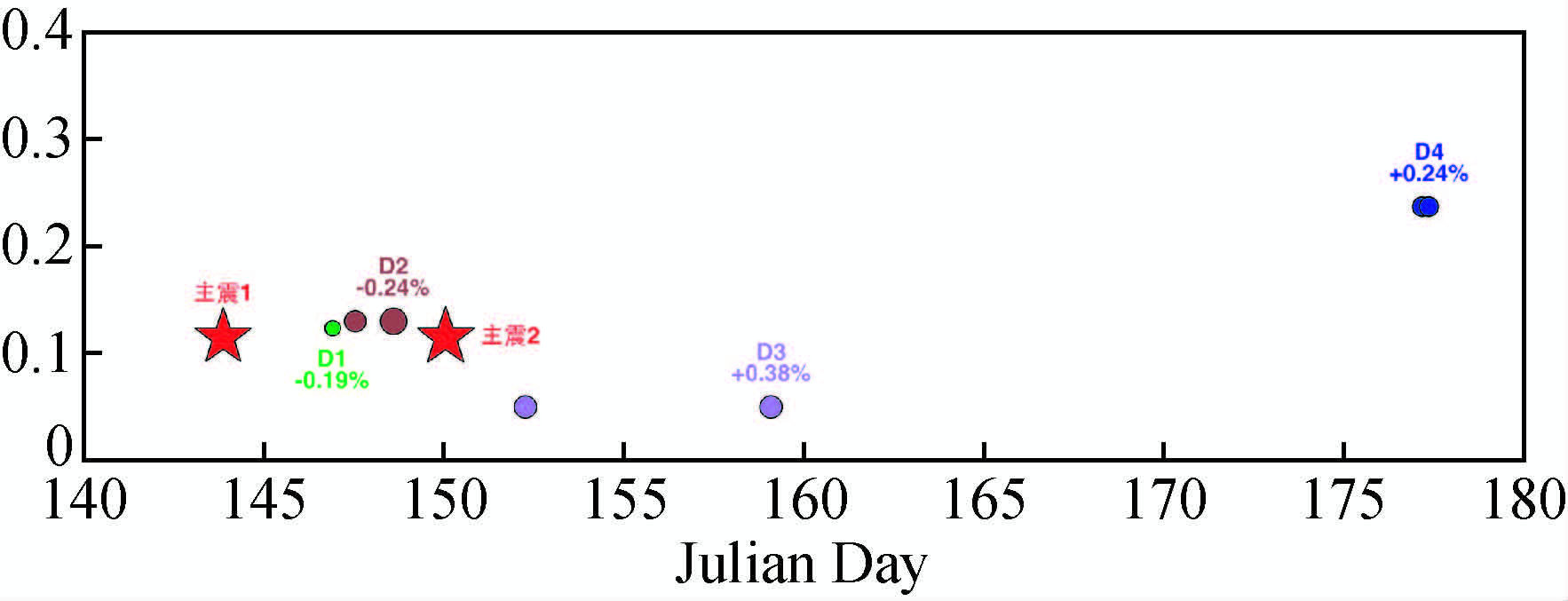 图 9 4对重复地震及2次主震的时空分布 横坐标为从2014年1月1日开始计数的天数,纵坐标为重复地震对和主震的发震位置与MNO台站的距离,单位为度,其中红色五角星代表两次主震,相同颜色圆形代表一对重复地震.发震时间在两个主震之间的重复地震D1、D2呈现波速下降的变化,而发震时间在主震2之后的重复地震D3、D4呈现波速上升的变化,其中两事件时间跨度最大且距离MNO台站最近的重复地震D3波速变化最大,约为0.38%. Figure 9 Spatial and temporal distribution of 4 repeating doublets and 2 main shocks Horizontal axis is the Julian day counted from January 1,2014 and vertical axis is the distances between these events and MNO station. The two main shocks are plotted by red pentagrams and circles in the same color represent a repeating doublet. Repeating doublets D1 and D2 show velocity had decreased during the two main shocks and repeating doublets D3 and D4 show velocity had increased after the second main shock. The biggest variation of velocity(about 0.38%)was acquired by repeating doublets D3 which has longest interval time and minimum epicenter distance. |