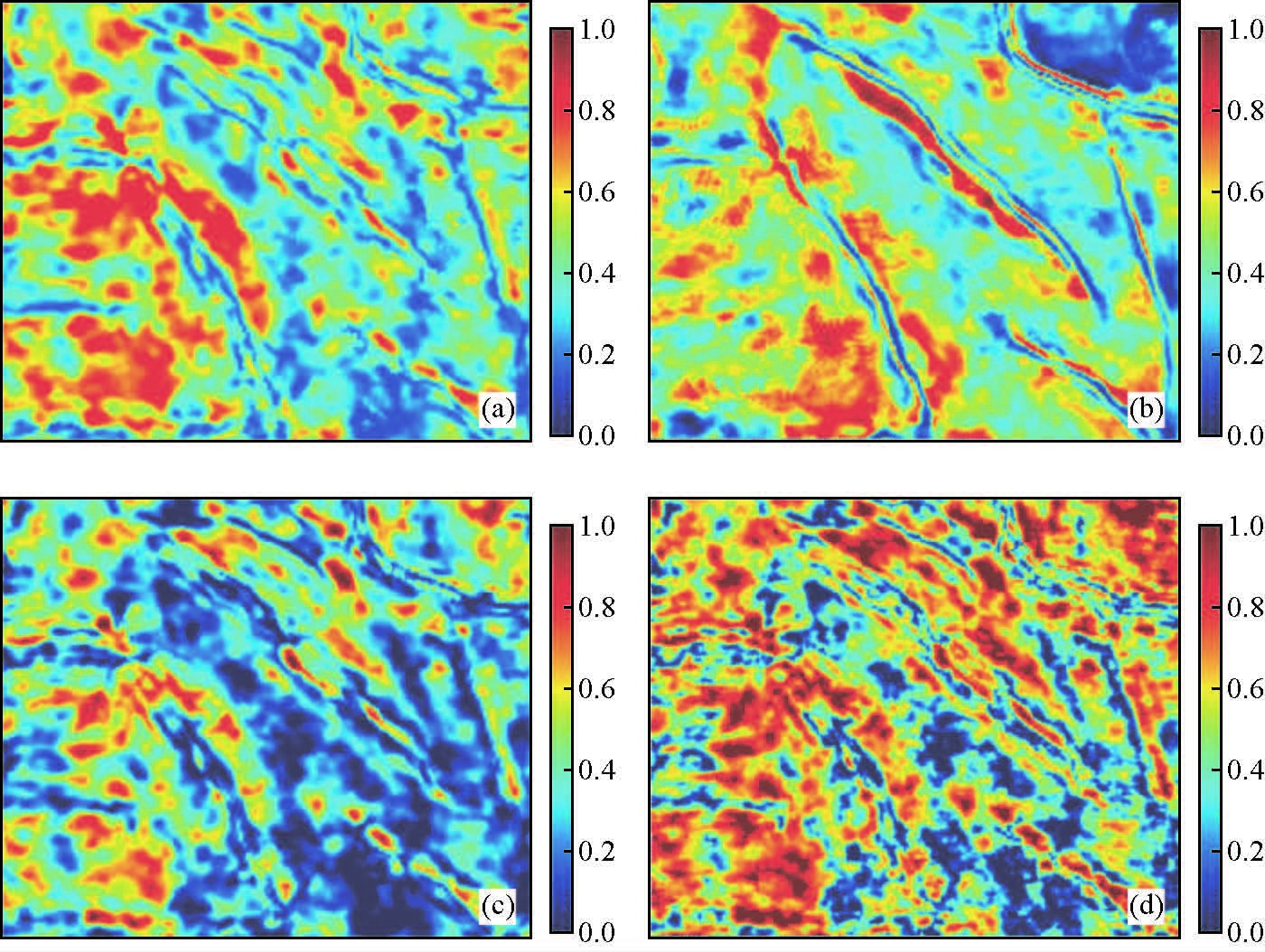 图 1 G油田X试验区F205单元地震属性图 (a)均方根;(b)最大波峰;(c)瞬时频率;(d)瞬时相位. Figure 1 The Seismic attribute map of F205 layer in G oil field X experimental zone (a)RMS;(b)Max peak;(c)Instantaneous frequency;(d)Instantaneous phase. |