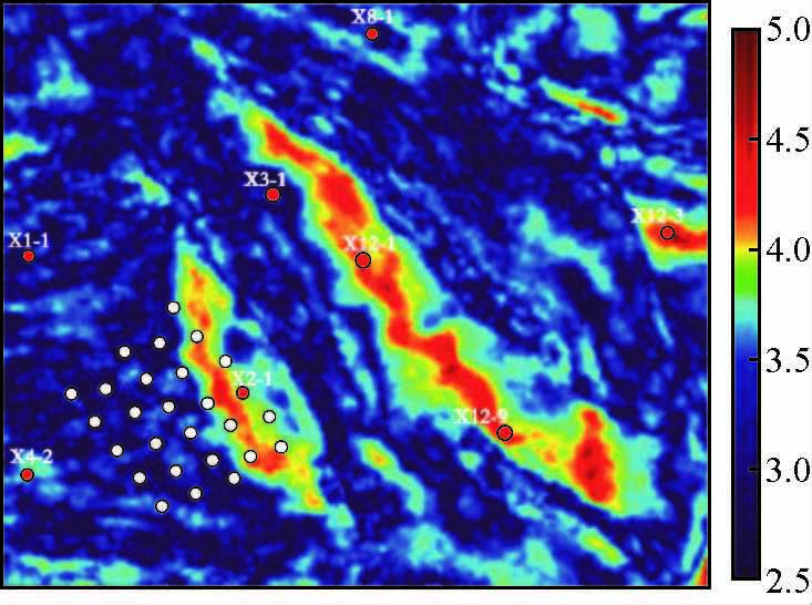 5.2本文提出在对振幅、频率、相位、波形及相关等多种地震属性提取基础上进行优选组合,确定输入的最佳属性组合,而后应用支持向量机方法获得地震属性预测图,同时为克服地震属性纵向分辨率低的缺点,应用测井曲线重构、随机反演方法,提高垂向分辨率,有效识别分流河道砂体厚度发育,从而实现分流河道砂体平面展布和厚度的综合刻画.