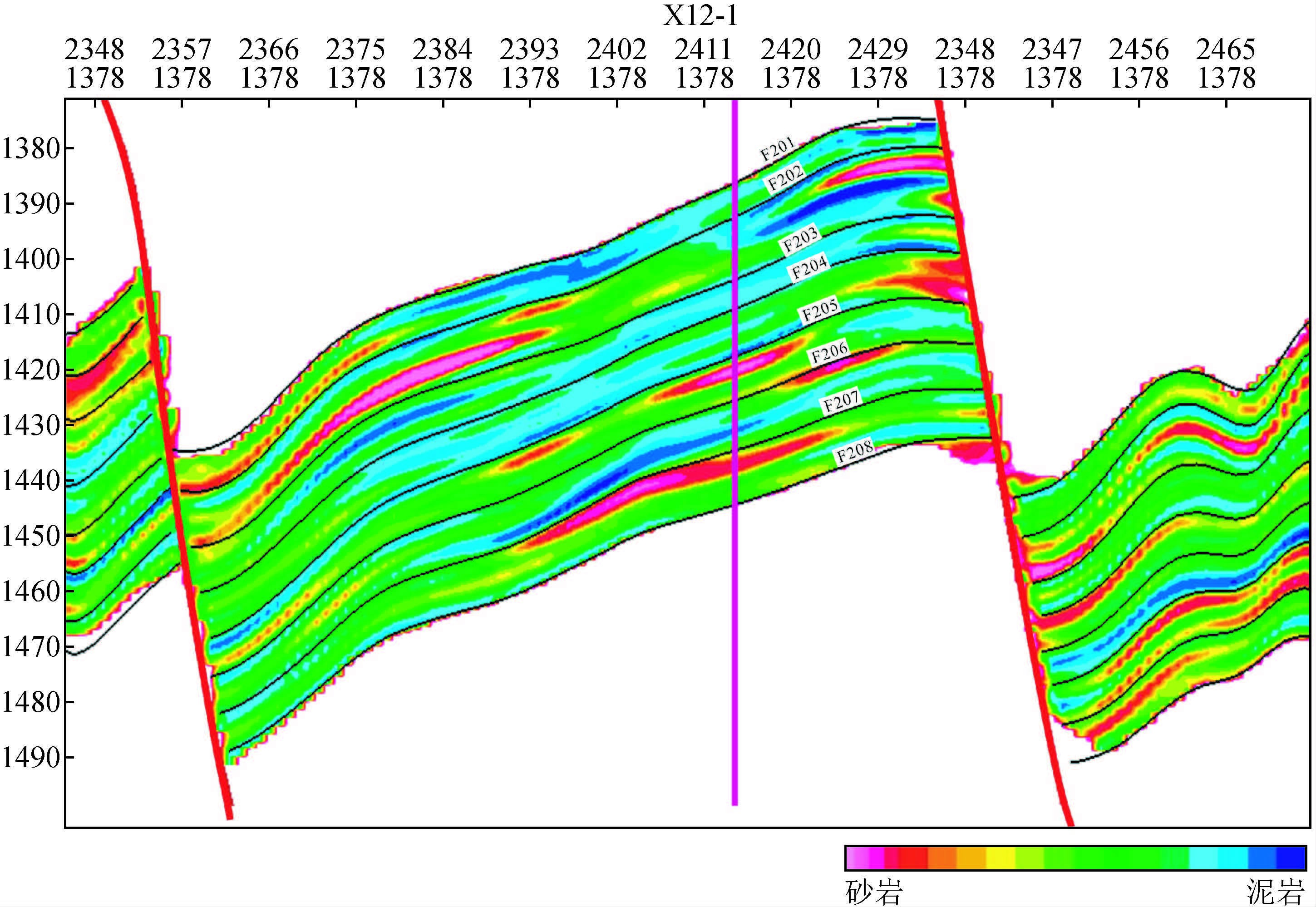 截止目前,在X区预测河道2中部设计了一口评价井G12-9,在F204和F205进行试油.如表 1,F205单元砂岩厚度4.8 m,有效厚度为4.6 m,试油方式为压后抽汲,试油结论为高产工业油层,后经岩心、测井曲线等证实,该井为典型的河道砂沉积体,这充分证明了本文提出的分流河道综合刻画方法对于扶余油层预测河道砂是有效的.