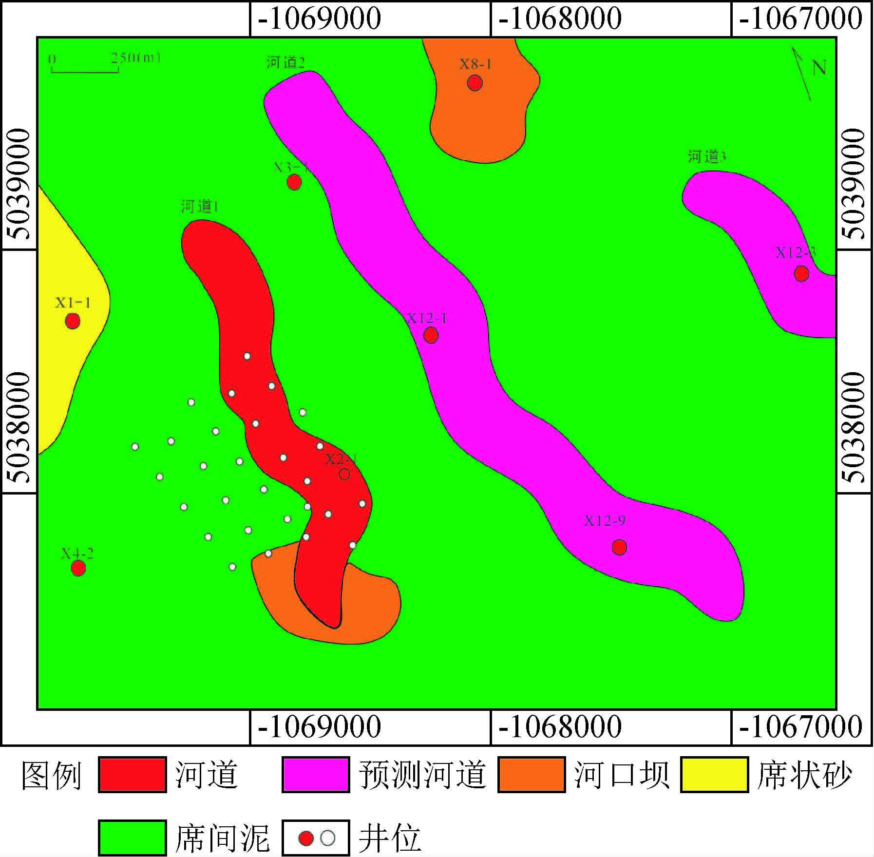 4 分流河道砂体综合刻画及验证 4.1 分流河道砂体综合刻画应用上述地震属性及地震反演方法可对主河道的平面展布及大于2 m砂岩厚度进行有效预测,但受到地震地质条件的复杂性影响,应用地震资料尚无法做到100%精确预测,因此在对分流河道进行刻画时,仍需结合井点实钻信息,实现井震综合刻画,具体实现流程如下:首先,利用已有岩心、测井、录井等资料,落实井点处河道相沉积;其次根据地震属性平面图刻画河道延伸范围和宽度,以及预测无井区河道展布;最后,结合地震反演预测成果对上述河道进行厚度厘定,从而对井点落实河道进行预测符合率评价,对地震预测河道进行平面展布和纵向厚度的全面刻画,据此提交钻探井位.本文以G油田X试验区扶余油层F205沉积单元为例,开展分流河道砂体综合刻画研究.X试验区主要为浅水枝状三角洲前缘亚相区,物源主要来自长垣北部,应用上述方法共识别出3条断续型分流河道沉积,均为北北西走向,其中,基于井落实河道1条,地震预测河道2条,如图 4.根据地震反演结果可知,河道1、河道3砂岩厚度在3 m左右,属窄小型河道;河道2砂岩厚度在5 m左右,发育规模相对较大.因此,G油田X试验区中部规模较大的预测河道2沉积为下一步井位部署的潜力区.