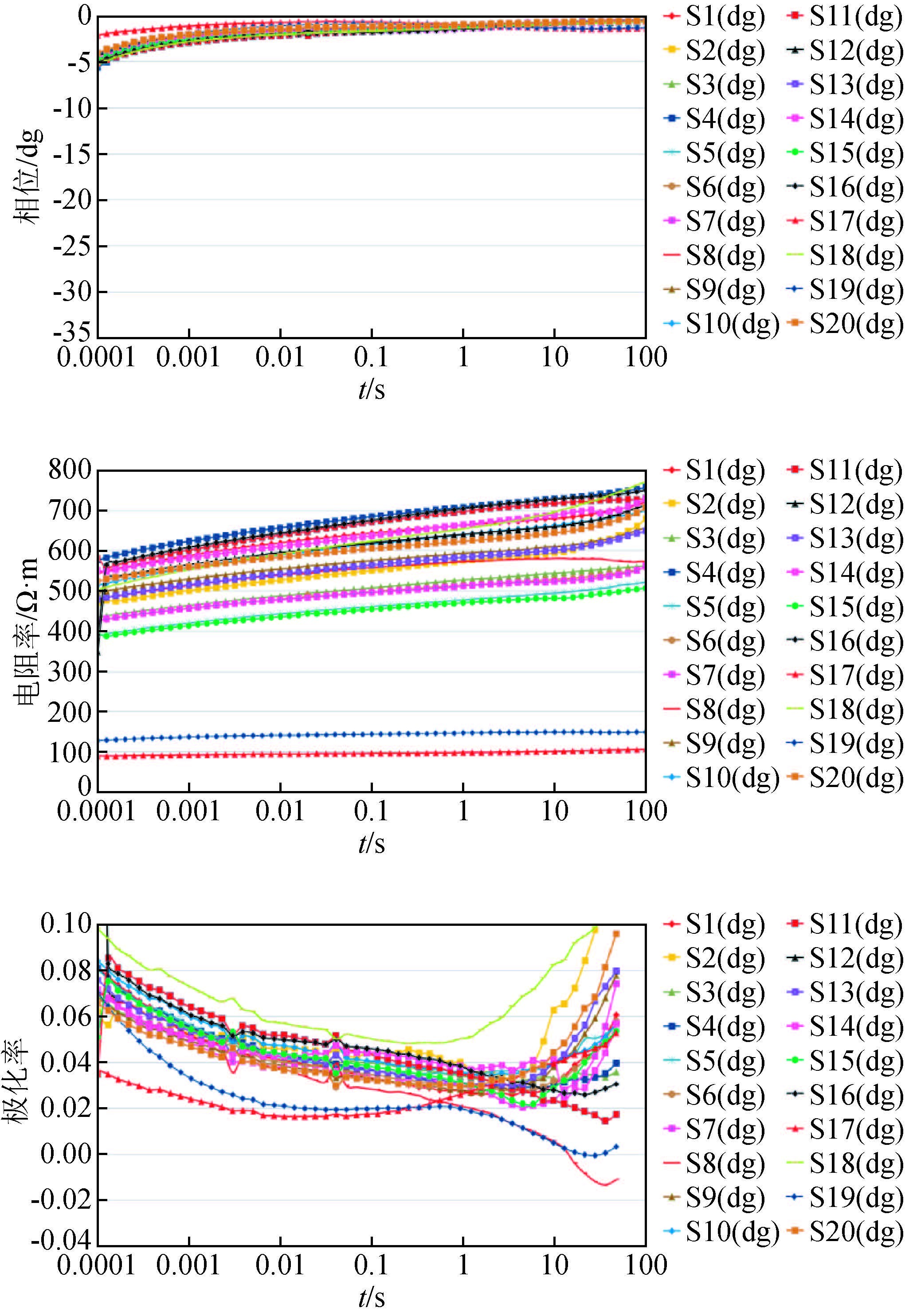 图 2 寒武系牛蹄塘组电阻率、相位、极化率—时间曲线 Figure 2 Cambrian cattle hoof pond resistivity、 phase、polarization-time curve |