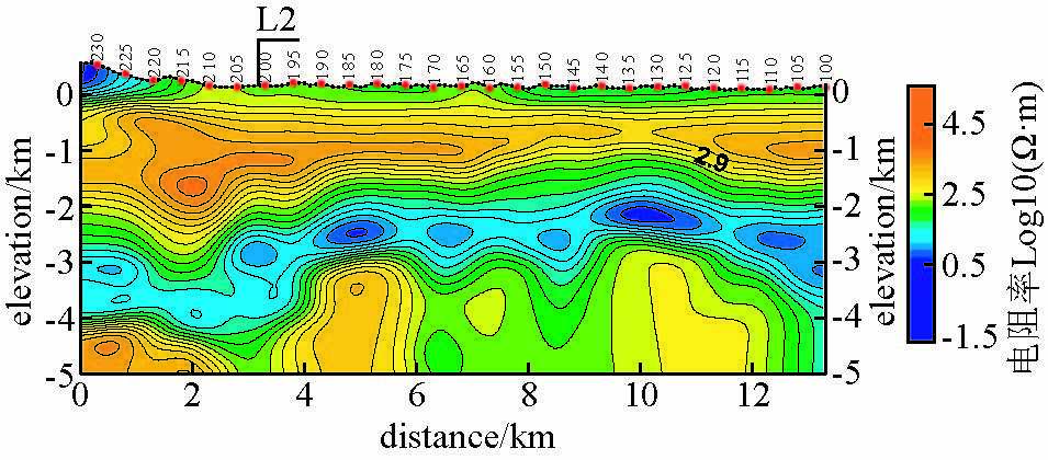 低阻层埋深的突变位置显示了断层对地层的错断,是自古生代以来区内多期次挤压构造运动的结果.220—205号测点范围低阻层顶面海拔埋深最大,达到-3500 m,其两侧低阻层明显变浅,推测该范围两侧存在F1和F2两条反向逆冲断层,导致两条断层上盘方向岩层向浅部逆冲,形成了两边浅,中间深的构造形态.同时,在挤压作用下两条断层直接的地层可能存在局部增厚的现象,这一点可以从深部低阻层、中深层高阻层的增厚特征得到印证(见图 12、13).