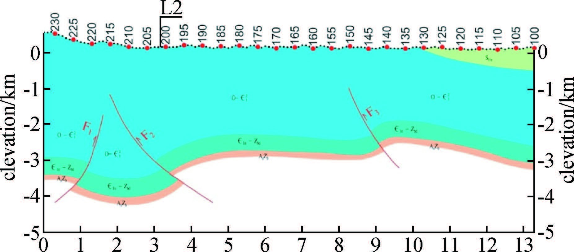 图 14 L2测线地质解释剖面 Figure 14 L2 line geological interpretation profile |