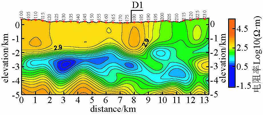 图 10 D1测线时频-地震联合反演电阻率断面 Figure 10 D1 line frequency-seismic joint inversion resistivity section |