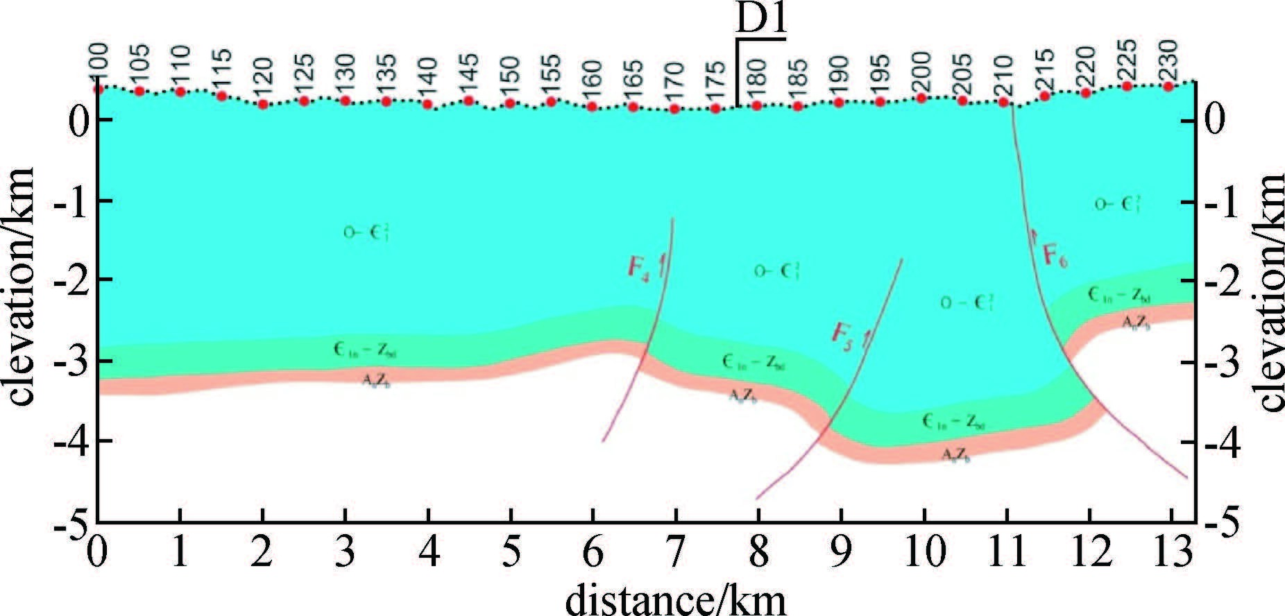 图 12 D1测线地质解释剖面 Figure 12 D1 line section geological interpretation profile |