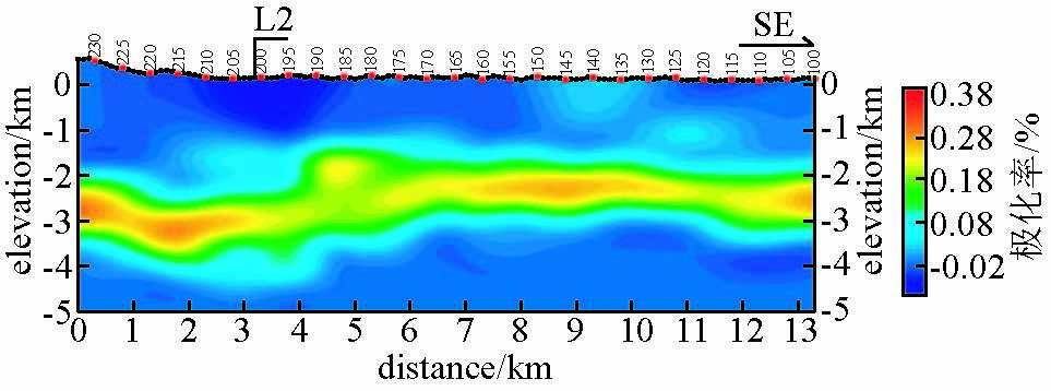 极化率异常的深度是在时间域反演结果的基础上转换而来的,因为没有钻井或地震资料标定,其深度值仅作为参考,只能用以定性解释富有机质页岩层系顺层方向极化率的变化规律,不能用来进行异常深度定量解释(见图 16).