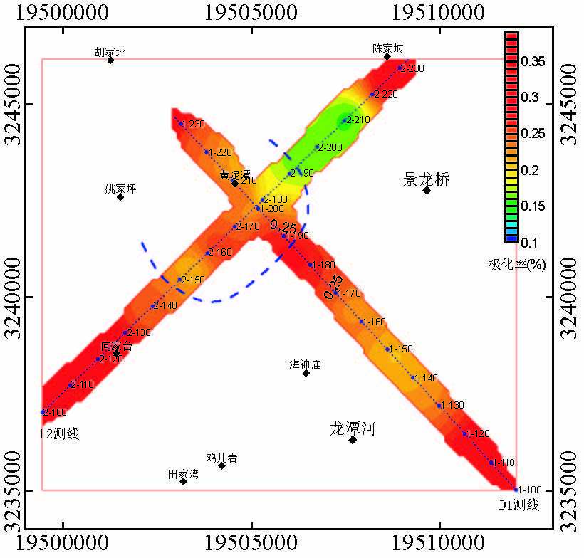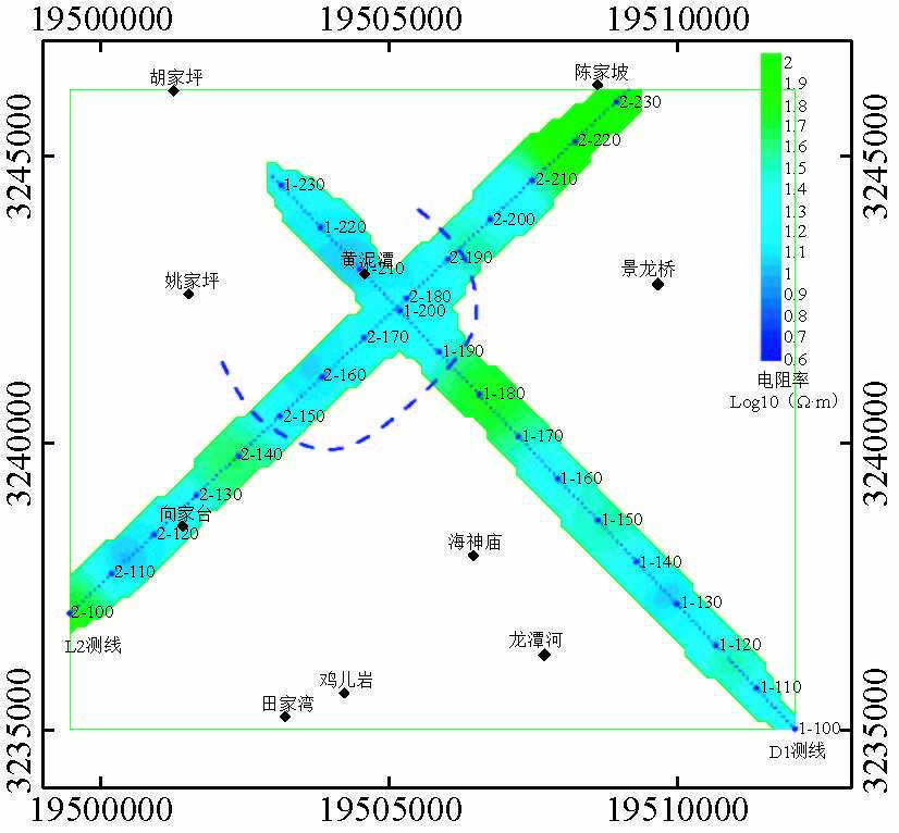同时结合页岩层系内部相对低阻异常区的分布范围推测,D1和L2测线交叉点位置及其附近高极化异常和页岩层系内部的低阻分布在平面上较为稳定,认为交点及其附近位置页岩气发育条件良好,见图 18中蓝色虚线圈定范围.