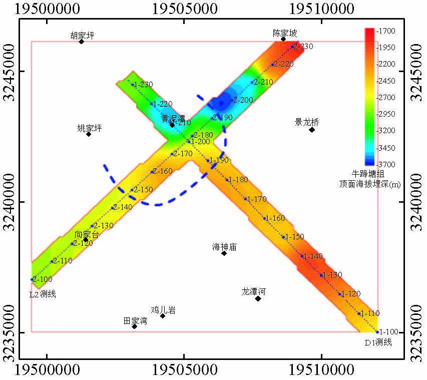 将页岩层低电阻区域叠合到牛蹄塘组顶面海拔埋深图上,见图 19.可见其重叠区域为D1测线233号—193号测点范围,L2测线的148号—192号测点范围.两侧线交点位置主体部分牛蹄塘组顶面海拔埋深-2000~-3000 m之间.D1的东南段和L2测线的东北段牛蹄塘组埋深相对较浅,顶面海拔埋深一般在-2500 m以浅.