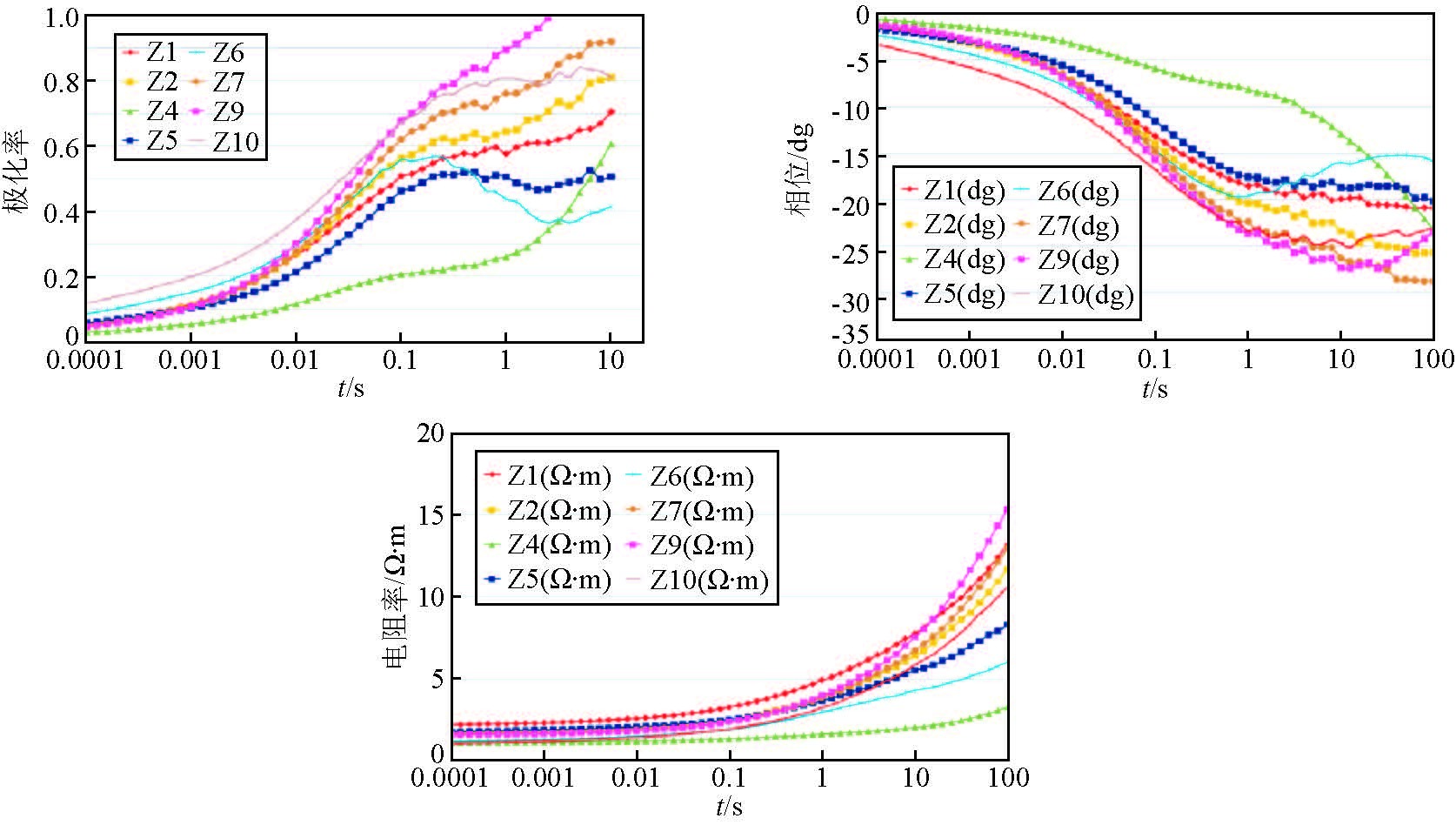 图 1 志留系龙马溪组电阻率、相位、极化率—时间曲线 Figure 1 Siluric dragon stream resistivity、phase、polarization-time curve |