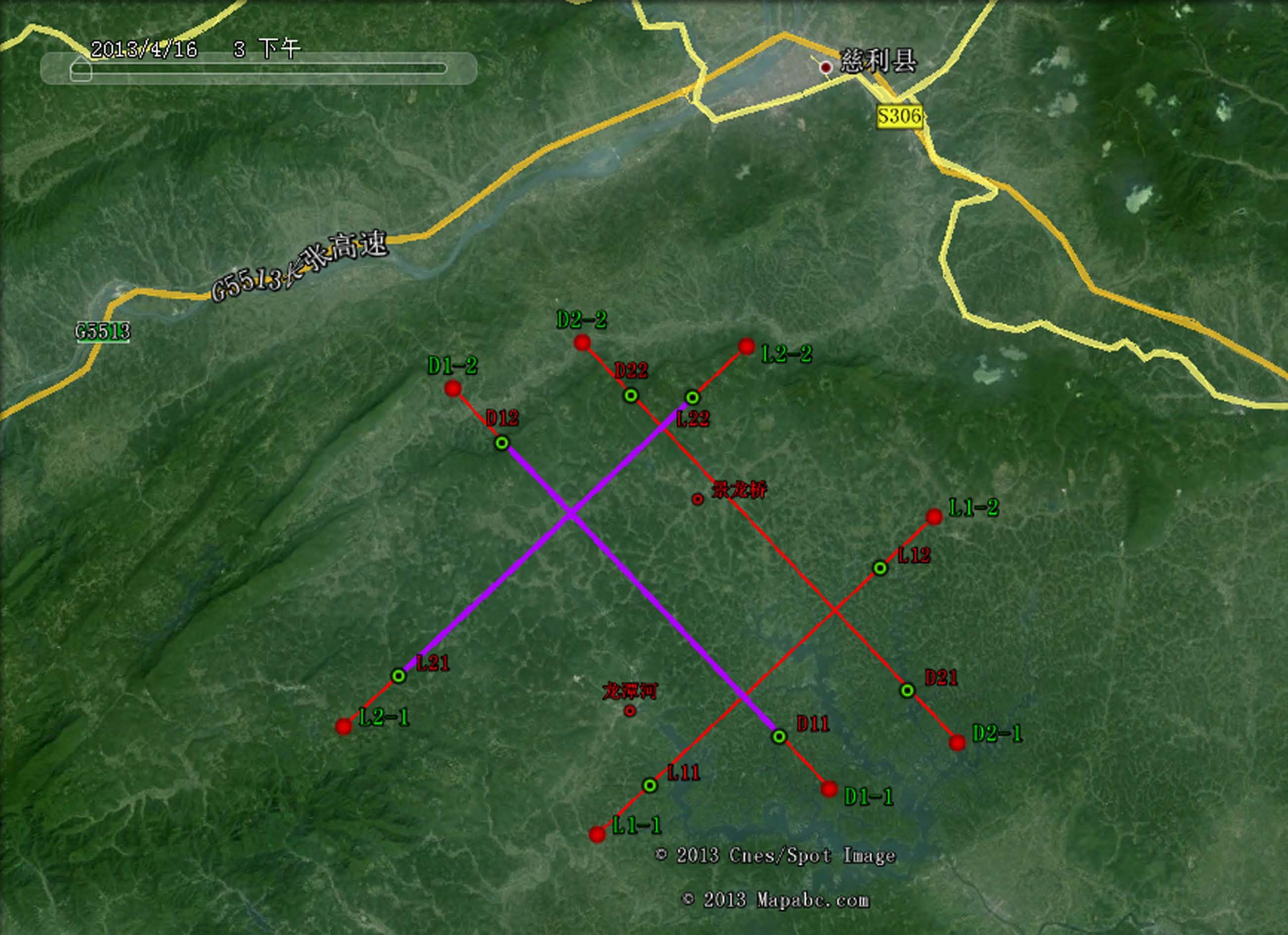 3 试验区概况此次试验区测线位于慈利县城以南景龙桥乡—龙潭河镇地区,南北长约20 km,东西宽约25 km,勘探面积约500 km2.测线布置如图 5所示,地震勘探共部署测线四条.(红色线段)选择D1和L2测线满覆盖范围为时频电磁勘探测线,总长26.4 km(图 5).(两条紫色线段为时频电磁勘探测线)两条测线均穿越山区,地形起伏大,植被覆盖茂密,主要出露地层有志留系龙马溪组、奥陶系、寒武系.地貌上高地与谷地相间,以山地形为主.龙潭河由西向东南方向流经试验区.
