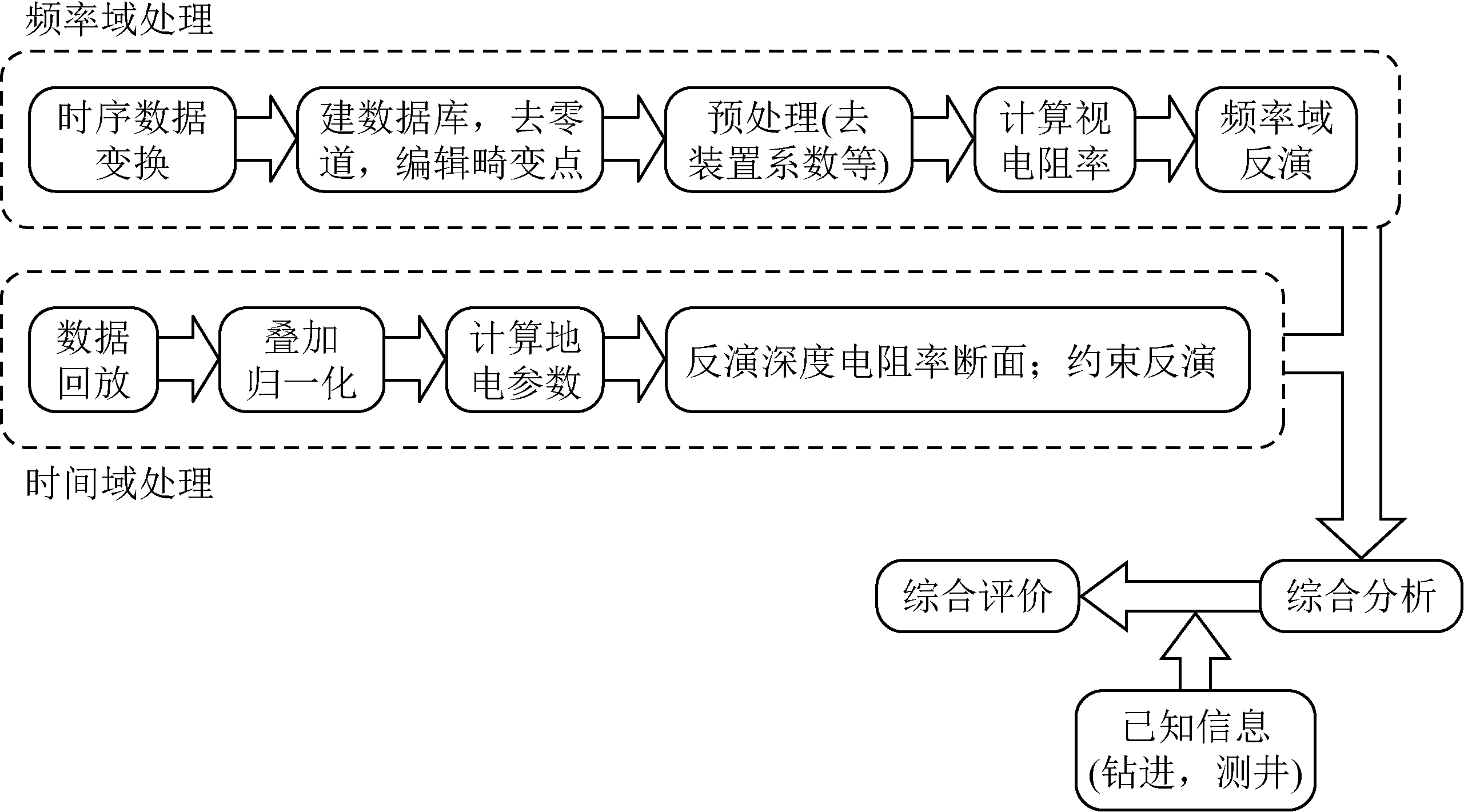 图 6 时频电磁资料处理流程图 Figure 6 Time and frequency electromagnetic data processing flow chart |