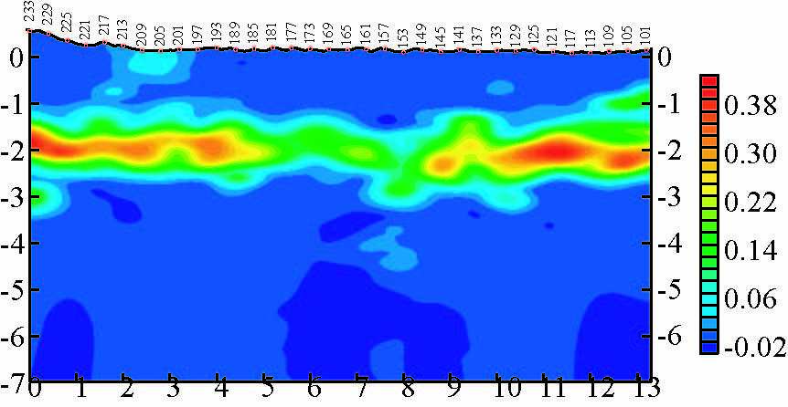 图 8 利用自由反演电阻率结果进行层位约束的极化率反演剖面 Figure 8 Using the free layer resistivity inversion resultsin polarization inversion profile |