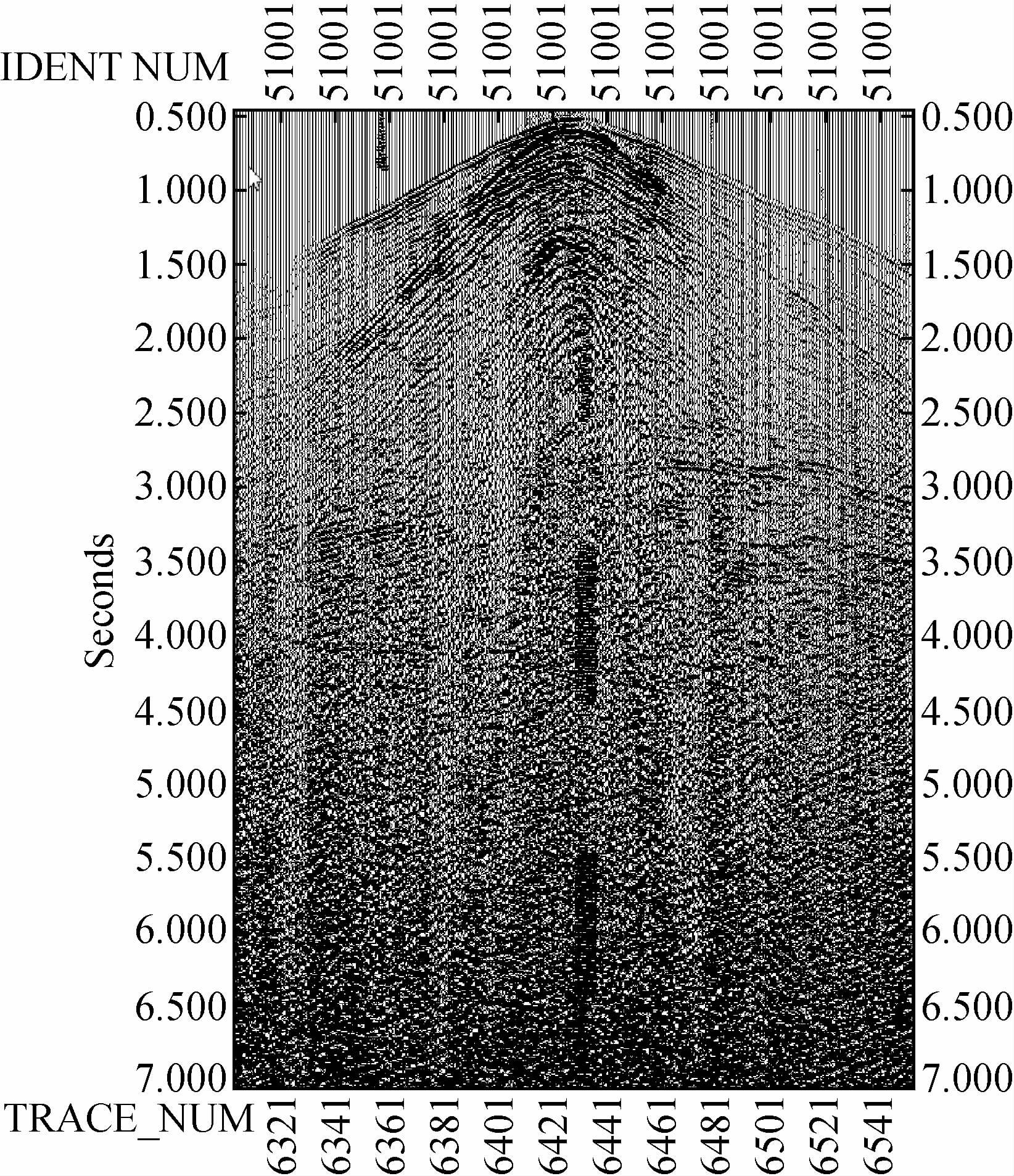 为了进一步分析基于速度模型的有效信号提取波场分离技术的实际应用效果,将该方法应用于对图 2所示的炮记录进行波场分离实验,结果如图 6所示.由该图可以看出,图 2中所标注的“同步震源干涉噪声”已基本不存在,说明了这种方法具有很好的实际应用效果.