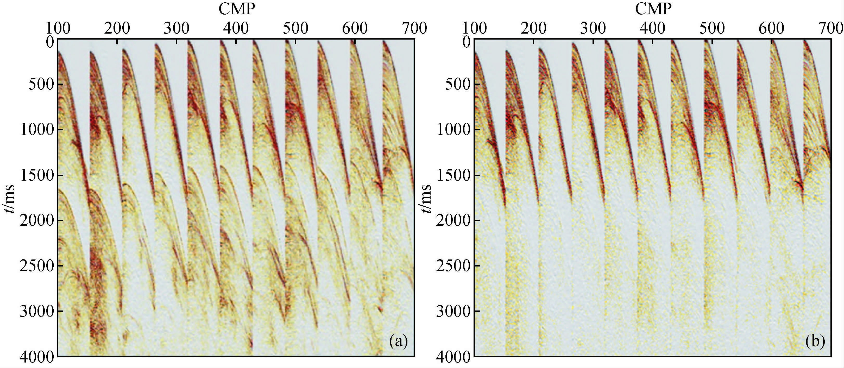 图 1 叠前输入炮集(a)和分步法多次波压制结果(b) Figure 1 The raw shot gathers(a)and the results(b)with multiple suppression by multistep method |