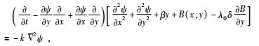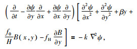其中ψ为流函数,Coriolis力的垂直分量取为f=f0+βy, fH是Coriolis力的水平分量, f0、β、fH均为常数;H是流体静止时的高度;B(x, y) 是地形轮廓;k是耗散系数, 取正数;▽2为Laplace算子, 定义为: