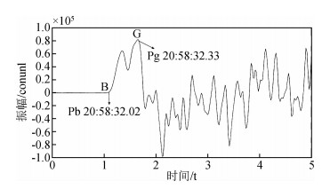 结合波形特征:地震波在G点处的振幅和周期都有变化,BG段的周期大于G点之后,但振幅较小,类似Pb和Pg的特征.综合分析得出:B点处为Pb震相,而G点处为Pg震相.