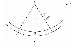 实际资料应用AA′,该反射面可视为由点绕射源组成的连续体.对地表的重合激发和接收点 (S点),来自地下O点的能量在t0=2z0/v时刻到达接收点.如果入射波前再向深部传播λ/4.来自地下A点或A′点的能量在t1=2(z0+λ/4)/v时刻到达接收点.在以OA′为半径的圆盘内所有反射点的能量,在t0~t1之间某一时刻到达接收点.在t0~t1时间间隔 (T/2) 内,到达接收点的总能量相长干涉.所以AA′称为第一菲涅尔 (Hubral et al., 1993).落在带内的两反射点在地表难以分辨.