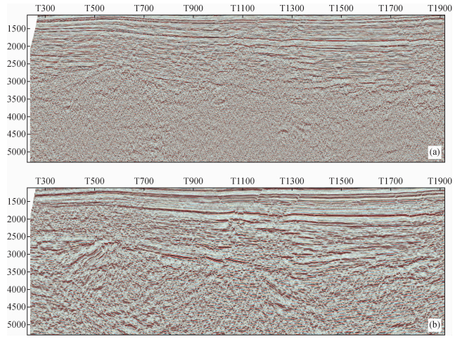 图 4 CMP叠加成像剖面和CRS叠加成像剖面对比图 (a) 基于CMP道集的常规成像剖面; (b) CRS叠加成像剖面. Figure 4 Imaging result comparison between CDP stack and CRS stack approaches (a) Section of traditional CDP stack; (b) New section of CRS stack. |
