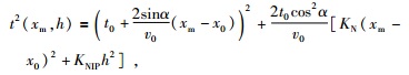 式 (2) 为旁轴射线走时的双曲型表达式.式中KNIP和KN分别表示Hubral (1983)引入的N波和NIP波的曲率半径,α表示零偏移距射线出射角,t0为零炮检距走时,v0为零偏移距处的速度,x0为零偏移距对应的坐标,xm为炮检之间的中点坐标,h为半偏移距.