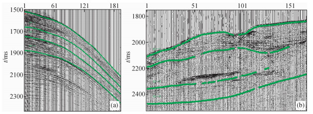 图 4 在共炮域 (a) 和共偏移距域 (b) 拾取反射走时 Figure 4 The travel time in (a) common shot domain and (b) common offset domain |