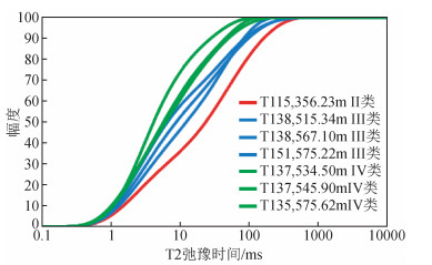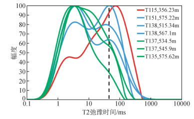 图 1 研究区储层核磁共振T2谱分布图 Figure 1 Distribution of NMR T2 spectrum about the reservoir in study area |