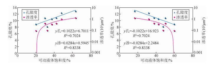 图 3 研究区可动流体饱和度与物性的关系图 Figure 3 Relationship between mobile fluid saturation and physical properties in study area |