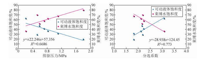研究结果表明:物性较好的样品,可动流体饱和度偏高,但相关性并不十分明显,这是由于可动流体饱和度的大小受多种因素综合作用的结果 (朱永贤等,2008;时宇等,2009;高辉等,2011;Gharbi and Blunt, 2012).从图 4可以看出可动流体饱和度与高压压汞相关参数存在以下关系,可动流体饱和度与分选系数呈正相关关系,束缚水饱和度与分选系数呈负相关关系,可动流体饱和度与排驱压力呈负相关关系,束缚水饱和度与排驱压力呈正相关关系,且两者的相关性均较强.由此可见排驱压力越低、孔喉半径越大、分选系数越大可动流体饱和度越高,而束缚水饱和度越低.