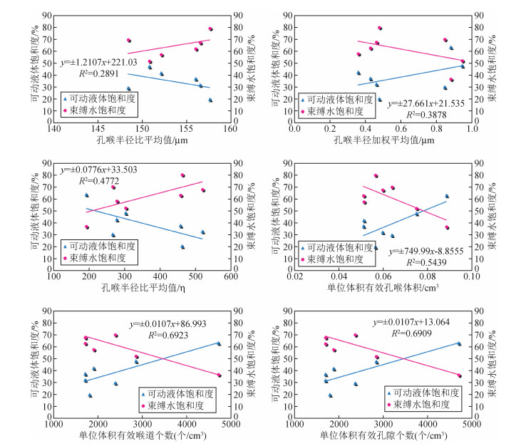 图 4 研究区可动流体饱和度与高压压汞参数关系图 Figure 4 Relationship between mobile fluid saturation and high pressure mercury injection parameters in study area |