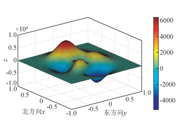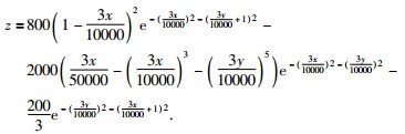 2 模型正演本文通过修改Matlab一个内置函数的系数,假定一个曲面函数做为航磁测量中飞机高度组成的曲面,函数为