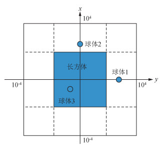 组合地质体模型为一个直立长方体和三个球体,其平面投影图如图 2.三个球体分别位于图 7所示的高度曲面极大值的下方,坐标为:(0,4400,2400)、(5600,0,5800) 和(-1800,-1400,2600),三个球体半径均为100,保证了每个球体在任一方向都不“冒出”曲面.直立长方体长×宽×高为:5000×5000×1000 m,上顶面设置为-5500 m,低于图 1中曲面最小值.曲面最小值基本处于长方体南边缘上,距离较近.