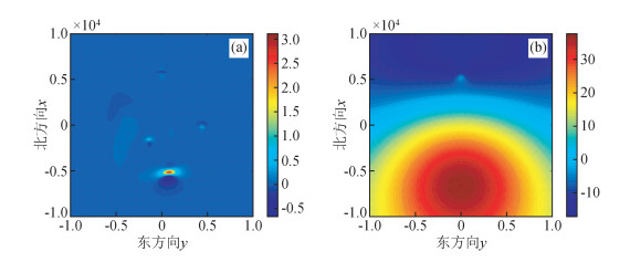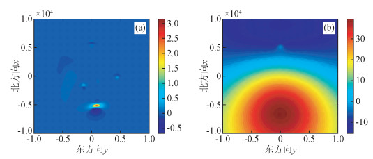 图 4 用曲面函数求曲面的法向导数图(a)和高度为6600 m的理论ΔT等值线图(b) Figure 4 The normal derivative determined from surface function (a) and the ideal magnetic anomaly ΔT at the height of 6600m (b) |