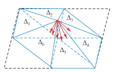 式(13) 表示求向量a的单位向量.由于三角元的法向量(detA detB detC)的模量为其面积的2倍,那么向量a就是节点j周围6个三角元的法向量的向量和,即周围每个三角元的单位法向量乘以其面积后求和,面积为每个三角元单位法向量的加权系数,再求向量a的单位向量.式(13) 和(14) 实际上是利用节点周围每个三角元的单位法向量及每个三角元的面积为权重计算出节点处的单位法向量(图 6).