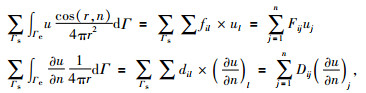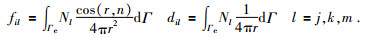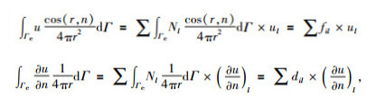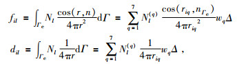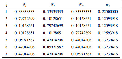 其中riq是i点到单元Γe上高斯积分点q的距离,cos(riq, nΓe)是riq与Γe的外法线方向nΓe的夹角的余弦,wq是加权系数,Δ是三角形面积,7点的高斯积分系数Nj、Nk、Nm和加权系数wq可以见表 1: