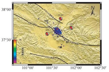 图 1 2016年青海门源MW 5.9级地震及其地震地质构造背景,黑色实线表示该地震区域内的活动断层,其中冷龙岭断裂是一条以左旋走滑为主的断层,红色五角星表示震中所在位置,蓝色圆点表示余震分布,其颜色深浅表示震源深度 Figure 1 The tectonic background of 2016 Qinghai Menyuan MW 5.9 earthquake, black lines represent the main faults in the area, wherein Lenglongling fault is a left-lateral slip faults, red star mean the location of epicentre, the blue dots indicate the distribution of aftershocks, which represents the focal depth by color shades |