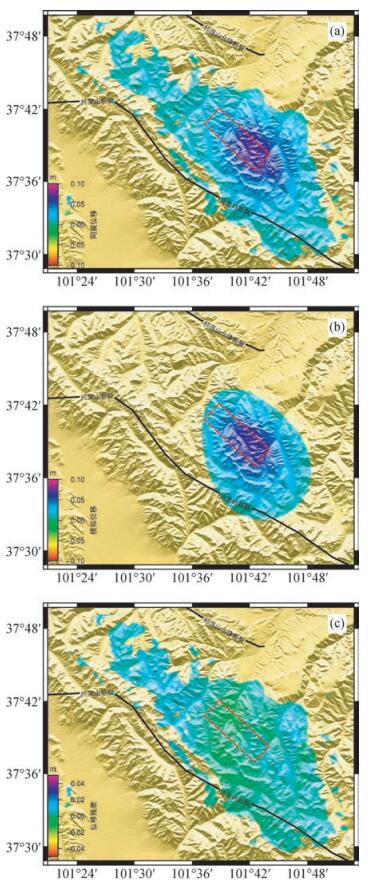 反演得到的断层走向和倾角与该区域余震形态高度拟合(图 1、图 2).断层滑动角为47°表示该断层为左旋兼逆冲断层,和冷龙岭断层的历史变化趋势和野外调查结果接近(中国地震局地球物理研究所, 2016).此次门源地震发震断层顶部距离地表约6.5 km,整体分布方向延冷龙岭断裂进行分布,在地表形成约57 km长的同震形变区域.