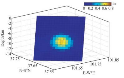 断层滑动分布图(图 4)显示,在地下6 km断层上滑动边界和地下11 km断层下滑动边界产生了约为25 cm的断层滑动,并向断层滑动中心逐渐增加,在断层滑动中心达到最大值约64 cm的断层滑动.