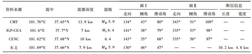 门源地震震中位于北纬37.68°,东经101.62°,地下深度7 km附近, 主震过后并未发生5级以上余震,其中最大余震发震于主震5 min后,为位于震中附近深度10 km的4.1级余震(Earthquake Hazards Program, 2016).截至2016年2月11日,主震附近沿近NE向共发生余震572次,余震分布如图 1所示.目前,该地震的发震要素、震源机制存在争议,CMT的震源机制解暗示此次地震为震中101.76°E,37.65°N,震源深度13.9 km的一次纯逆冲型地震(CMT, 2016),而USGS暗示此次地震可能为震中101.641°E,37.671°N,震源深度19.5 km的一次纯逆冲型地震(USGS, 2016),但实际野外构造调查显示此次地震应为走滑兼逆冲型地震(中国地震局地球物理研究所, 2016).