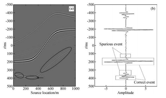 图 5b为图 5a沿震源位置叠加得到的虚源记录,由沿零时刻对称的因果与非因果波场记录组成,实方框内为直达波与反射波.对简单模型而言,稳相位理论(Snieder et al., 2006)是解释虚源记录形成的有力工具,当震源位于图 3中地表S上时,其对应于互相关道集中的箭头位置,对应的时间与虚源记录中反射波的到时一致,称S点为稳相位点.稳相位点及其周围菲涅尔带内的相关道集称为稳相位区域,如图 5a中实线椭圆所示,虚线椭圆为非稳相位区域,稳相位区域对虚源记录的形成有主要贡献.在图 3所示的观测系统下,对虚源记录中的直达波而言没有对应的稳相位点,这是因为A点和B点位于同一个深度,其直达波对应的稳相位点位于地表无限远处.