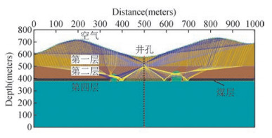 同样以800 m/s作为层析反演初始梯度速度模型的起始值,速度约束范围为800~5000 m/s,建立初始速度模型,采用5 m×1 m进行网格划分,运用SIRT反演算法反复迭代直到满足精度,获得如图 12的速度模型.图 12中以蓝绿黄红色标表示速度递增,我们可以看到层析反演结果纵向分层较好,横向上由于采空区的存在,在煤层附近速度场不连续,而且左侧采空区尺寸较小,在速度场中反应不太明显,只能定性解释其位置,同时其周围产生了一些假异常区.而右侧较大的采空区反应较明显,其位置和大小与正演模型资料相吻合.经过RVSP探测正反演理论研究,采用RVSP技术能够有效重建复杂地区速度模型,甚至有效识别该区域煤矿采空区.
