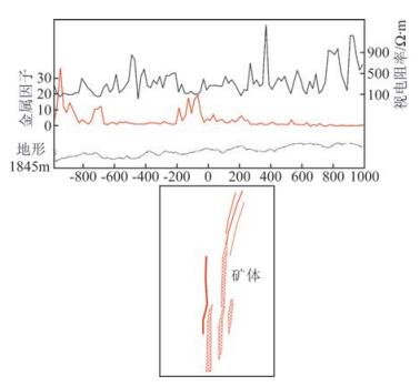 图 8 金属因子及视电阻率剖面曲线与矿体产出简图 Figure 8 The metal factor and apparent resistivity profile curve and orebody diagram |