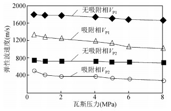 煤储层中的气体(煤层气)主要以吸附态赋存于孔裂隙表面.瓦斯在煤体的赋存状态(游离态、吸附态)不同其物性特征也存在一定的差异(周枫, 2014).徐刚等(2009)以Biot的饱和流体多孔隙介质弹性波传播理论为基础,对无吸附相模型和吸附相模型的瓦斯煤体的弹性波进行了研究.研究结果表明:无吸附相模型的弹性波速度随着瓦斯压力的增加略有下降,这也与刘盛东等(2005)、张平松等(2006)研究结果相对应,与单相介质的煤相比相差不大;吸附相模型的弹性波速度随着瓦斯压力的增加而下降趋势明显,表现出明显的双相介质特征,如图 4所示.这一发现也与现存煤岩物理理论(Gassmann, 1951; Biot, 1956)以及实验室测定其他种类煤岩样品的成果一致.