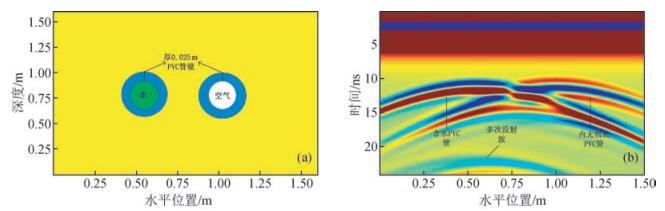 2.2 管道内不同物质分析图 3a为两个PVC管内部装有不同物质的异常体在同一背景介质中的模型.模拟区域长与宽为1.5 m×1.5 m,背景介质的电导率为0.01 S/m,相对介电常数为6.0.在(0.60 m, 075 m)、(1.05 m, 0.75 m)位置处各有个半径为0.15 m的PVC管,管壁厚度为0.025 m,左边PVC管内部充满水,右边PVC管内部无物质,只有空气.其他参数同上例,每隔0.005 m采集一道雷达数据,总共采集了300道雷达数据.