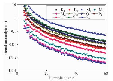 图 2 FES2004海潮模型提供的不同潮波对重力场结果前60阶的影响 Figure 2 Different tidal constituent effect on GRACE (FES2004) |