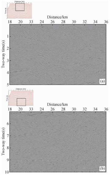 图 8 宽线地震共反射面元叠加剖面局部放大展示 (a)浅部局部放大展示;(b)中深部局部放大展示. Figure 8 Zoom-in display of the CRS stack of the swath-line seismic data (a) Zoom-in of the shallow part; (b) Zoom-in of the middle and deep parts. |
