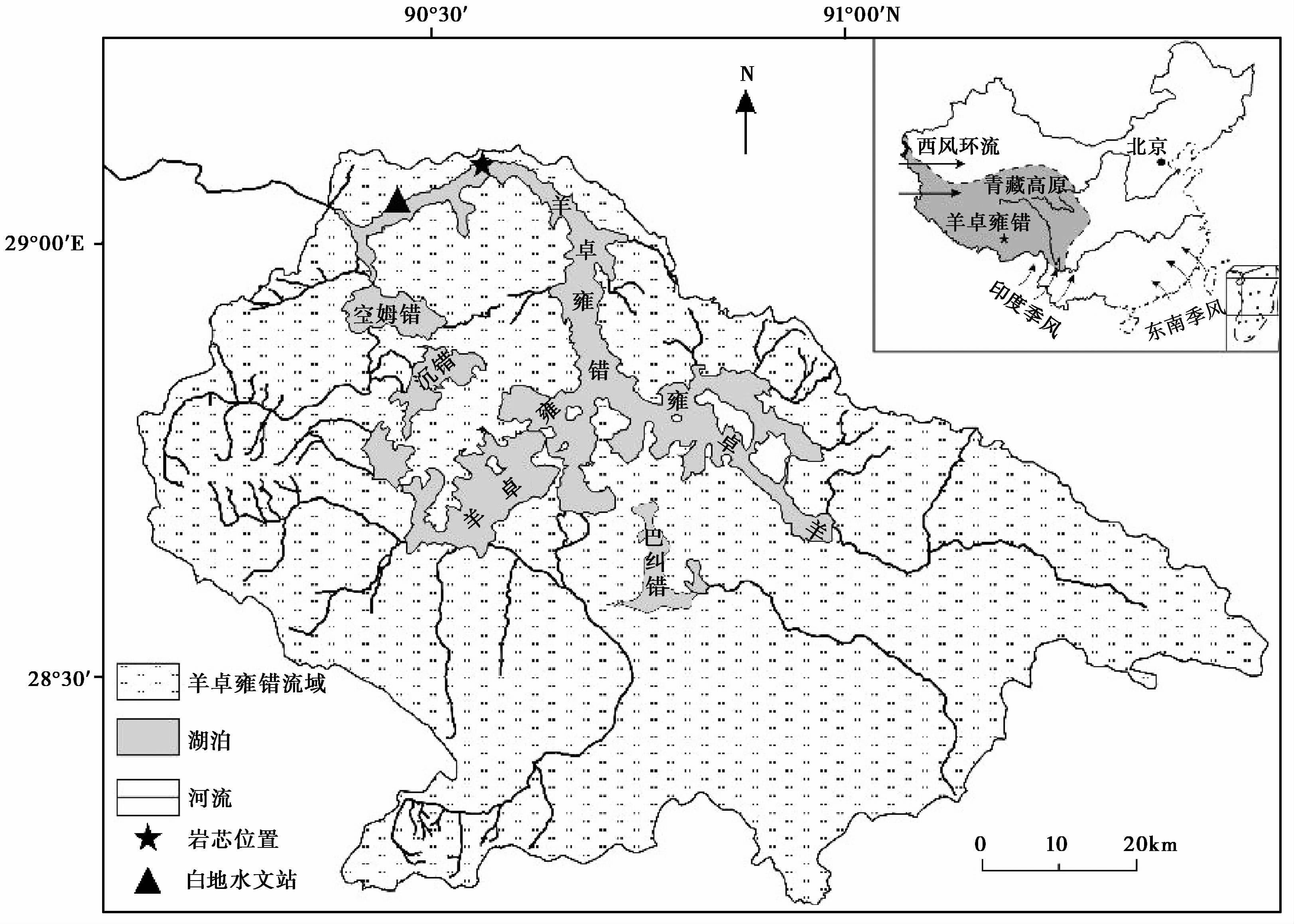羊卓雍错(以下简称羊湖)位于青藏高原南部,前人对湖泊的研究主要集中在现代空间遥感[31]、 湖泊水文监测[32, 33]以及流域水化学性质[34, 35, 36, 37]等方面,而对该地区的古气候研究,尤其是过去2000年来较高分辨率气候变化的研究尚无报道。为此,本文选取羊湖沉积物为研究对象,以较好的年代数据为框架,通过对岩芯的粒度分析,高分辨率地重建青藏高原南部过去近2000年以来的干湿变化,并与周边地区和全球古气候记录进行对比,探讨过去2000年青藏高原南部对全球气候变化的响应及可能存在的驱动机制,以期对全面理解季风区高海拔地区的气候变化过程、 时空差异及原因提供参考。