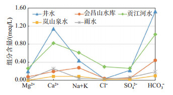 4 分析讨论 4.1 水化学特征根据地下水舒卡列夫分类方法(毫克当量百分数超过25%的阴阳离子按含量多少依次参与命名),会昌流体井水的水化学类型为HCO3-Ca型。为了更好观察常量组分的分配规律,根据所测水样分析结果绘制阴阳离子三线图,见图 3,可见:井水中主要阳离子为Ca2+,主要阴离子为HCO3-;井水的水化学类型为HCO3-Ca型,会昌山水库、贡江河水、岚山泉水等水体的水化学类型为HCO3-Ca-Na型和HCO3-Na型,水化学类型不同,说明两者没有显著的水力联系,而且井水样在2019—2023年不同时期的水化学组分变化不大,水化学类型基本一致,均处于HCO3-Ca型水区域。