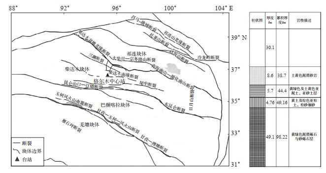 1 观测背景格尔木流体观测井位于柴达木盆地南缘(图 1),成井于1978年10月,为青海省水文地质一队使用过的废弃井,井深98.22 m,高程2 802 m,地下水类型为承压水。其主要含水层由第四纪黄绿色泥质砾石、沙砾构成,上部覆盖有10 m厚的亚粘土层,具一定封闭性。补给源主要为基岩裂隙渗水,地下水径流通畅,水质优良,水化学类型为Na-HCO3型,总溶解固体量为1 125.2 mg/kg。据2017年水化学离子含量检测结果,钙离子含量为39.5 mg/L,镁离子含量为37.51 mg/L,钠离子含量为149.7 mg/L,钾离子含量为8.34 mg/L,碳酸氢根离子含量为230.6 mg/L,硫酸根离子含量为84.12 mg/L,氯离子含量为115.4 mg/L。