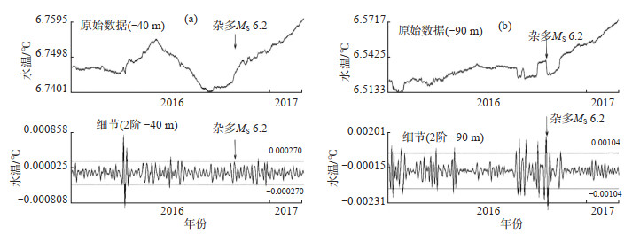 由图 2可见:①-40 m水温:2016年4月5日—10日,-40 m水温原始日均值曲线出现明显下降。小波细节2阶显示,2016年3月31日—4月18日,高频信息明显增大,呈显著异常现象[图 2(a)],其幅度超过2倍均方差,182天后发生杂多MS 6.2地震(震中距403 km),地震前后异常形态差异明显。②-90 m水温:2016年1月2日—2月1日、8月24日—10月2日,-90 m水温原始日均值曲线出现阶变变化,10月17日杂多MS 6.2地震发生后,当日同步再次出现阶变变化。小波细节2阶显示,2016年8月20日—10月29日出现异常信息,并于异常期内发生杂多MS 6.2地震。