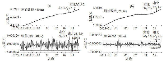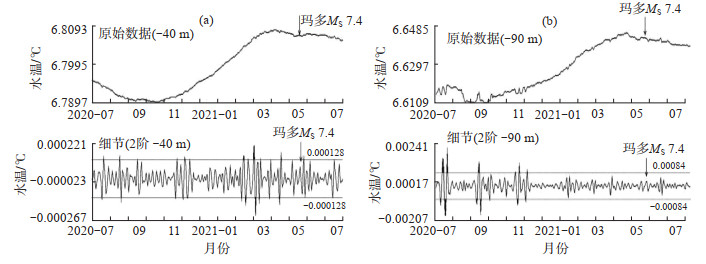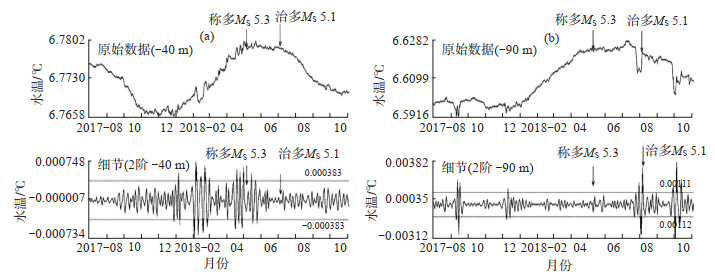 3.1.2 称多MS 5.3地震、治多MS 5.1地震由图 3可见:①-40 m水温:2017年12月18日—2018年1月4日,-40 m水温原始日均值曲线出现小幅阶变变化,小波2阶细节显示,2017年12月25日—2018年1月10日出现异常变化;2018年2月5日—19日,-40 m水温原始日均值曲线再次出现阶变变化,后于4月3日—5月23日出现突跳,而其2阶细节几乎同期出现异常,具体时间为2018年1月25日—3月5日、4月14日—5月23日,且在第2次异常时段内发生称多MS 5.3地震(震中距257 km),并于此次异常出现72天后发生治多MS 5.1地震(震中距286 km)。②-90 m水温:2017年9月5日—9月17日、12月2日—2018年1月14日,-90 m水温日均值原始曲线出现突跳变化,小波2阶细节显示基本同期出现2次异常,具体时间为2017年9月5日—22日和2017年12月2日—2018年1月31日[图 3(b)],第2次异常出现后94天发生称多MS 5.3地震;2018年7月22日—8月3日-90 m水温日均值原始曲线出现阶变变化,小波2阶细节显示,于2018年7月15日—8月3日基本同期出现异常,异常结束当日,即8月3日发生治多MS 5.1地震。